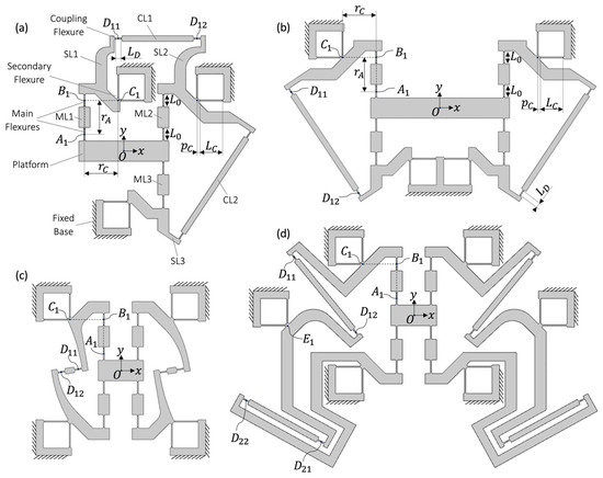 Based on the generic Type I TRIOSTAGE (Section 2.1) and its kinematic variants (Section 2.2), we select four -RRR rectilinear stage structures of interest. The performance will be compared when embodied with flexures (Section 3).
