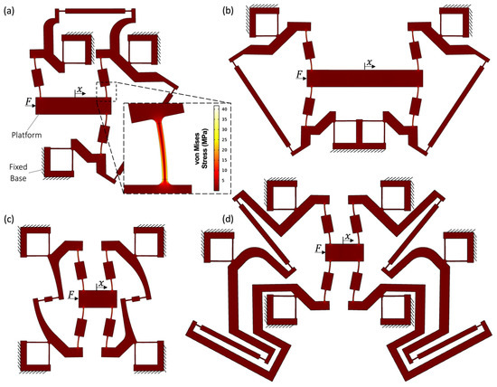 The analytical and FEM values of the maximum stress for a range of motion of ±6 mm are reported in Table 3. In the FEM models, the maximum von Mises stress is situated in the main flexures of the mechanisms (Figure 8) and is obtained at the maximum amplitude (i.e., at ±6 mm), as expected. Since all mechanisms have identical main flexure dimensions, the analytical model and the FEM model give, respectively, equal and nearly equal maximum stress values (Table 3). The analytical value is consistently slightly lower than the simulated value. This is primarily due to the stress concentration located near the filets. In addition, the analytical model does not take into account the tension in the main flexures that is produced by the deformation of the secondary and coupling flexures.