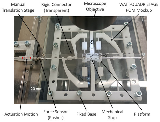 The stiffness constant predicted by the analytical and FEM models is verified experimentally with the WATT-QUADRISTAGE POM mockup. A stiffness of 0.928 N/mm is obtained by linear regression of its measured force–displacement characteristics. This result is in good agreement with the FEM data, since the relative difference is lower than 1%.