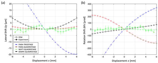 FEM and experimental results of the selected rectilinear stages: (a) lateral and (b) rotational parasitic shifts as a function of the translational displacement .