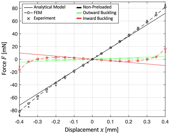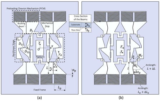 where is the total flexural rigidity of the beams, accounting for the flexural rigidities of both the substrate and the thin film (see inset in Figure 11), and . It can interestingly be noted that if the buckled beams deflect with an outward buckling direction (as opposed to the inward buckling direction illustrated in Figure 11b), then the sign of is reversed. Considering both the positive stiffness of the stage flexures (Equation (6)) and the negative stiffness provided by the buckling beams (Equation (10)), the total stiffness is given by: