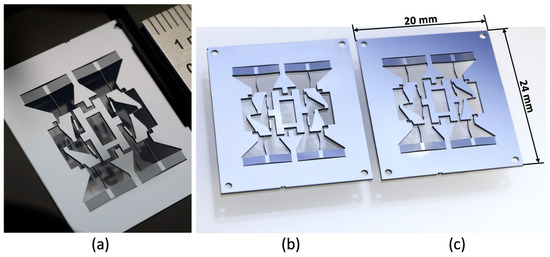 - Tissot-Daguette, L.; Cosandier, F.; Gubler, Q.; Petremand, Y.; Despont, M.; Henein, S. Residual Stress Chevron Preloading Amplifier for Large-Stroke Stiffness Reduction of Silicon Flexure Mechanisms. J. Micromech. Microeng. 2025, 35, 025003. [Google Scholar] [CrossRef]