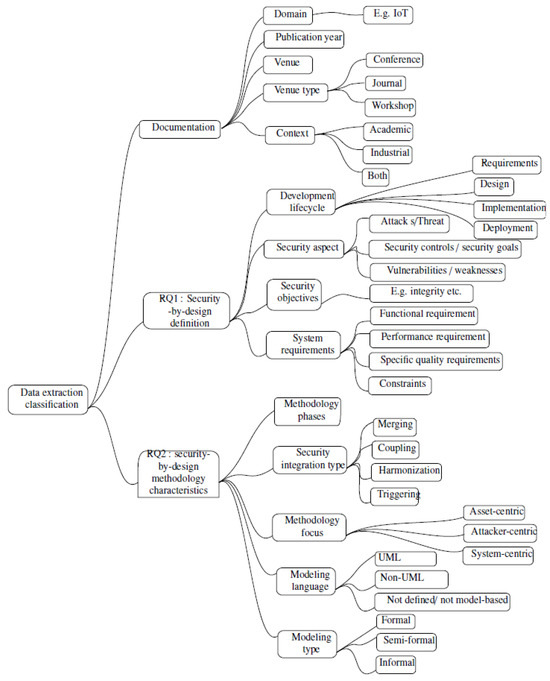 This section details the research questions raised in Section 1. The first concern of this systematic mapping is to extract from the primary studies the elements that define a security-by-design methodology. For that, RQ1 is divided into four sub-questions. First, as previously stated, security by design means the integration of security into the early stages of the systems development lifecycle. Hence, as asked in RQ1.1, what exactly are the system development lifecycle phases concerned by security-by-design methodologies? Answering this question allows us to refine the definition of a security-by-design methodology to which system development lifecycle phases are based on. Second, each security-by-design approach focuses on a combination of security aspects to analyze the security of a given system design. These security aspects could be attacks/threats, vulnerabilities, or security controls. So, as mentioned in RQ1.2, which security aspects (e.g., attacks, threats, vulnerabilities, and security controls) were focused on? The answers to these questions will help us discover the common ways and the basis of system security analysis used for security-by-design methodologies. Third, given their nature, the security objectives of CPSs differ from those of IT systems. To find out which security objectives (confidentiality, integrity, and availability) are prioritized during the integration of security into the design of CPSs, we aim to answer RQ1.3; that is, which security objectives (CIA, etc.) were addressed? Fourth, a security-by-design methodology must not ignore the effect of security on other functional and non-functional requirements. For this, the question (RQ1.4: Which other system requirements were considered while integrating security?)will help us discover which system requirement type has been preserved during the integration of security.
