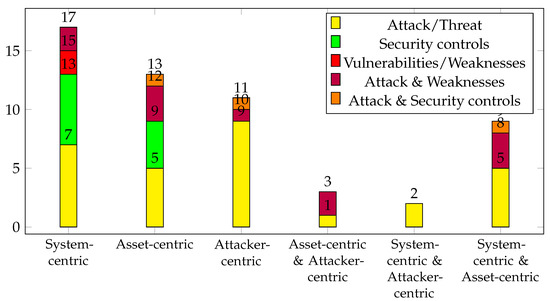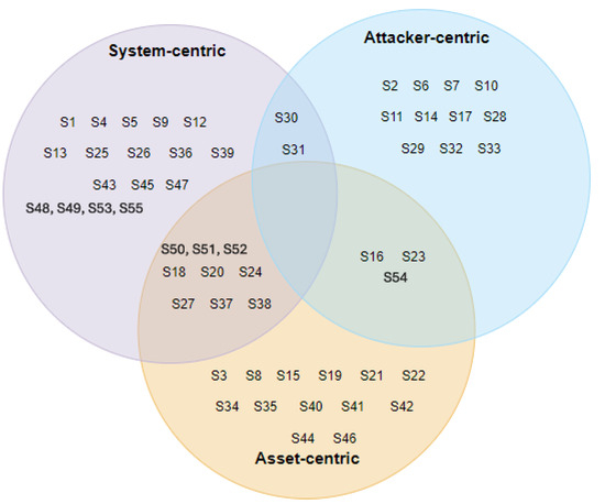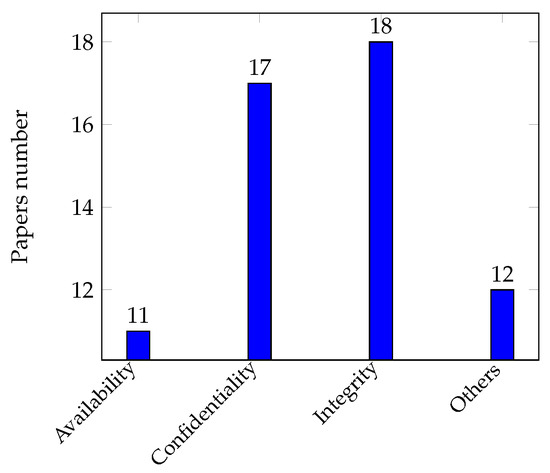 - Security objectives: These mainly consists of confidentiality, integrity, and availability (CIA) [21]. Other cybersecurity concepts are considered as security objectives such as authentication and non-repudiation. They are mentioned in this systematic mapping as “other security objectives”.