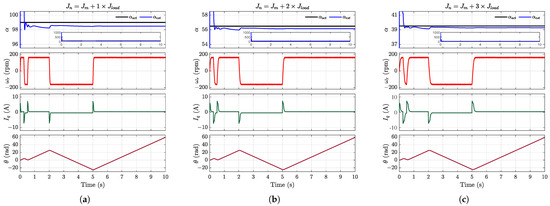 The parameters of the MFSC-API, MFSC-NDOB, EMFSC-NDOB, and AEMFSC-NDOB controllers were chosen as follows: = 160 and = 10 for the MFSC-API controller; = 400 and L = 50 for the MFSC-NDOB controller; = 400, = 1, L = 50, and = 0.3 rad/s for the EMFSC-NDOB controller; and = 400, = 1, L = 50, = 0.3 rad/s, and = 20 for the AEMFSC-NDOB controller. The reference speed was 90 rpm, and the inertia of the load was chosen as = 0.00134 kg·m2. Therefore, the theoretical value of the input gain was .