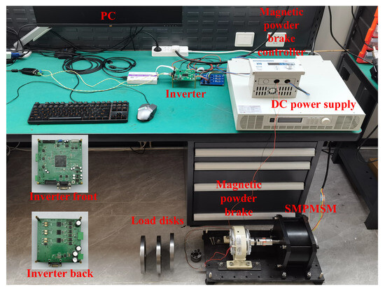 To further verify the effectiveness of the proposed control scheme, some real-time experiments were carried out. Figure 6 depicts the experimental test platform, which was governed by a TMS320F28379D digital signal processor (DSP). The control circuit was composed of a power supply (RU-36-10036), SPMSM (J155LWX001), two-level inverter, and measurement circuit.