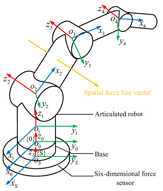 According to the force compensation model, the robot needs to represent the generalized compensation force and joint torque experienced by each connecting rod in the sensor coordinate system , assuming no external force, within the force compensation algorithm. Among them, the generalized compensating resultant force is the sum of the three directional components of the generalized inertial force and the resultant force of the connecting rod’s own gravity, expressed as