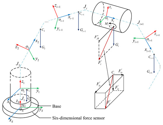 According to the Kane’s dynamics equation, the force compensation model of the joint-type collaborative robot can be established, as shown in Figure 3. Among them, the dashed line represents each link of the robot, and the coordinate system of each connecting rod and its own gravity are also represented. The generalized compensating force of connecting rod i is also shown in the figure.