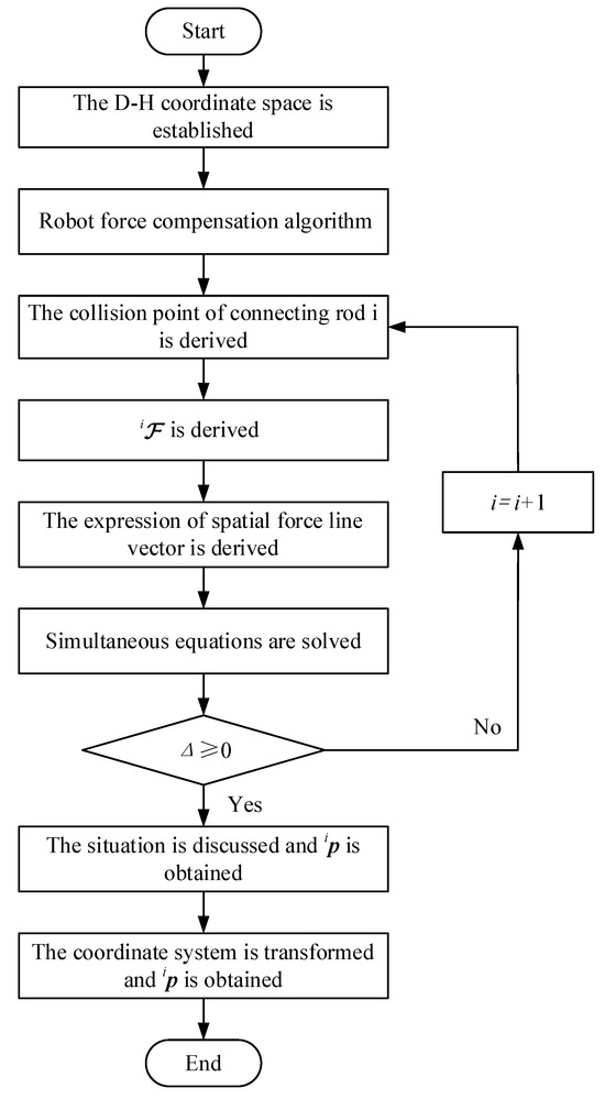 By substituting the detection results into the equation, if , the force vector equation intersects with the robot connecting rod i at , where is the position vector of the collision point existing in the coordinate system . The specific situation of the collision point can be discussed and solved in 9 different ways. If , meaning no collision point exists on connecting rod i, the same method should be applied to continue discussing the robot connecting rod . After obtaining , it needs to be converted to the base coordinate system, where the resulting position vector is the final collision point , expressed as follows