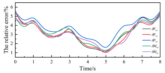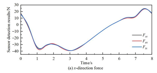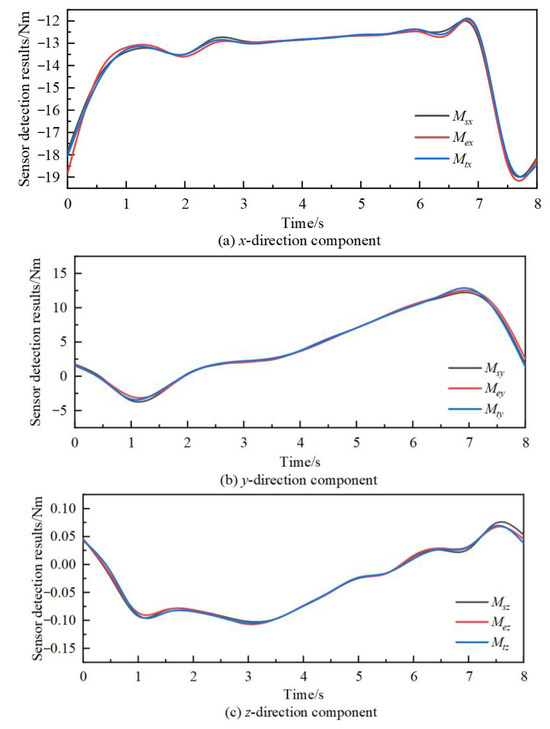From Figure 8, Figure 9 and Figure 10 and Table 4, it can be observed that the comparison curves of force/torque in the three directions remain consistent, with the maximum relative error occurring in the z-direction component. Due to the significant gravity and dynamic force exerted by the robot itself in this direction, the overall error during comparison verification is relatively high. However, the relative error does not exceed 5.6%, confirming the correctness of the theoretical analysis of the force compensation algorithm. When the robot runs for 4 s to 6 s, the relative error of the three directions of force/torque is minimized. During this period, the end of the robot moves in the x-positive direction, and the acceleration of the robot linkage motion is minimized. From this, it can be concluded that during the working process of the robot, a smaller rotation amplitude of each joint led to smoother movements and more stable changes in force/torque, resulting in more accurate force/torque compensation values. This force compensation algorithm demonstrates higher accuracy and stronger practicality, effectively compensating for the zero position value of the sensor of the robot in real time without external force.