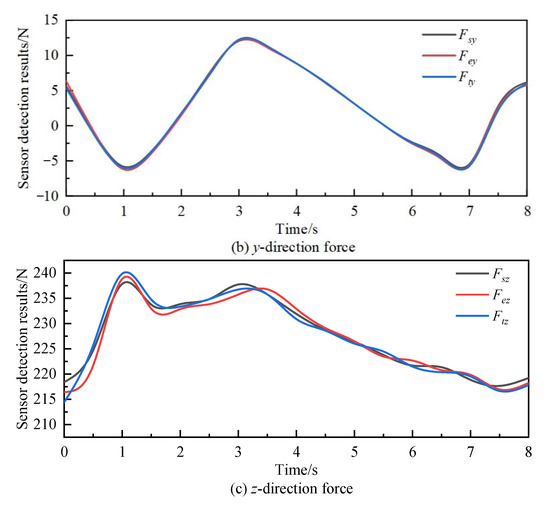 According to Equations (14)–(17) and (19)–(32), the theoretical results for robot force compensation can be obtained. The velocity and acceleration during each time period can be obtained from the simulated velocity curve. Based on Equations (14)–(17), the velocity and acceleration at the end can be iterated onto each connecting rod, and the force and torque experienced by each connecting rod can be represented on the sensor coordinate system as theoretical values, expressed as , , , , , and . Similarly, the data obtained through simulation can be represented as , , , , , and . The data obtained through experiments can be represented as , , , , , and .