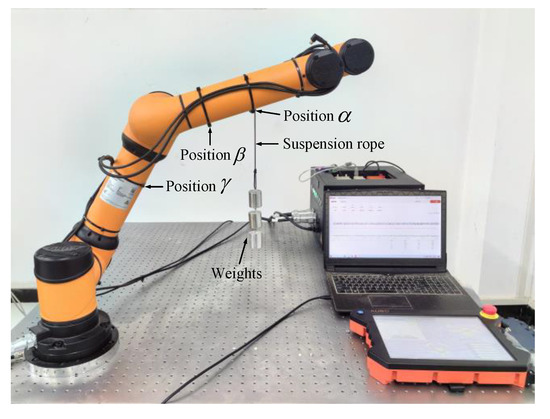To simulate collision forces of known magnitude and direction, weights are suspended on the robot connecting rod and the suspension rope is cut to simulate the collision force. The position of the simulated collision force is known, and the experimental result is based on the sensor coordinate system.