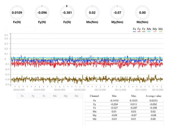 The six-dimensional force sensor can convert multidimensional force/torque signals into electrical signals, and can be used to monitor the changes in the magnitude and direction of forces/torques in three spatial directions. It represents a new branch of force sensors [18,19,20,21,22,23,24,25,26]. By installing the six-dimensional force sensor on the robot’s base to ensure safety in human–robot interaction, it not only reduces costs but also effectively reduces the system’s computational load, improving the system’s response speed. When the six-dimensional force sensor provides force/torque feedback to the robot’s control system and outputs the data to the upper-level computer, the operator can respond immediately and formulate the next task, achieving better compliance control during the robot’s operations and human–robot interaction [18,27,28].