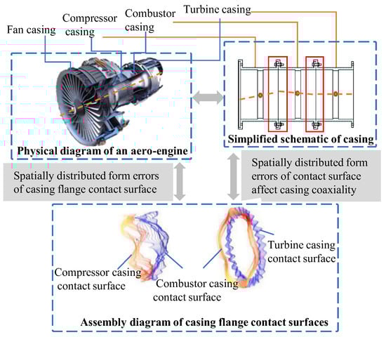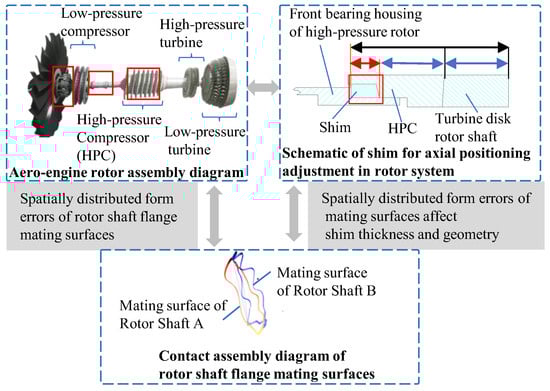 During the design phase, a dimensional chain analysis serves as a critical tool for the rational tolerance allocation of components [], while providing essential references for subsequent control of the machining and assembly accuracy. With increasing product complexity and higher integration of component structures, the conventional dimensional chain analysis methods face significant challenges. In high-complexity and large-dimension scenarios, such as aero-engines, the effects of error propagation and accumulation substantially complicate dimensional chain analyses. This study focused on the influence of geometric errors, particularly the spatial distribution of form errors, on spatial dimensional chains. Spatially distributed form errors refer to the widely spaced deviations of the real surface from the nominal surface []. Such errors result in inconsistent clearances. As illustrated in Figure 1, the impact of spatially distributed form errors on the final assembly accuracy is demonstrated. The figure shows that when a plane with spatially distributed form errors is assembled with an ideal plane, the non-uniform distribution of form errors within the error area induces a rotational displacement of the ideal plane. Furthermore, as shown in Figure 2, the casing assembly consists of multiple components. The combined effects of dimensional errors in individual parts, geometric errors of mating surfaces, and multidirectional constraints on composite mating surfaces of the flange interfaces (including both axial constraints such as end-face contacts and radial constraints such as spigot fits) may lead to out-of-spec closed-loop dimensions (e.g., coaxiality errors in the casing assembly), potentially requiring assembly process adjustments that extend the production lead time and increase manufacturing costs. As shown in Figure 3, the axial assembly distance of the rotor is a critical parameter in ensuring aero-engine assembly quality. However, due to geometric errors at component mating surfaces, the axial relative positioning between the high-pressure compressor rotor and turbine rotor requires multiple trial assemblies to select appropriate shims for dimensional compensation. When treating either the shim thickness or post-assembly axial clearance as the closing loop, the accurate determination of this loop becomes key to reducing aero-engine manufacturing costs. The complexity of assembly analyses stems from multiple factors, including the large dimensions of component mating surfaces, cumulative errors during multicomponent assembly, and complex multiconstraint mating relationships at assembly interfaces. A conventional dimensional chain analysis is inadequate in addressing these challenges, creating an urgent need to develop distributed-form-error-based spatial dimensional chain analysis methods.