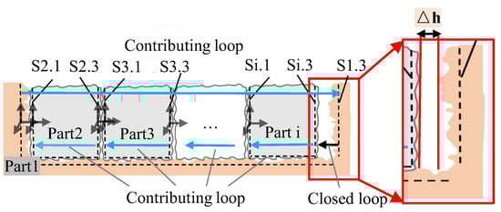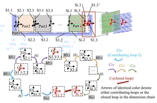 Similarly, when assembling part 3 relative to part 2, the local coordinate systems are defined at their key mating surfaces—the ideal mating-constrained data (S2.3 and S3.1) and the actual mating-constrained datum (S2.3/3.1). The geometric error M2.3 between S2.3/3.1 and S2.3 is also treated as a zero-nominal-dimension contributing loop and merged into part 2’s contributing loops. The homogeneous transformation matrix (HTM) Hi characterizes the pose variation between ideal datum planes within the loop (e.g., H2 represents the relationship between datum planes S2.1 and S2.3), where the translation matrix Ti describes positional offsets and the rotation matrix Ri accounts for angular changes in Equation (1). In Figure 8, elements connected by arrows of the same color belong to the same contributing loop. The set of contributing loops is denoted as {Cb1, Cb2, …, Cbi}.