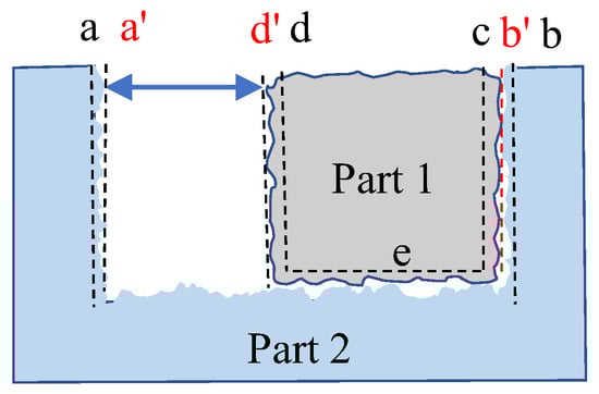Meanwhile, in practical engineering, geometric errors propagate through the geometric relationships in the dimensional chain. The constrained mating surfaces of parts often involve more than one pair of critical interfaces (as shown in Figure 4, where the key mating surface of part 2 serves as a key datum plane in the dimensional chain, with its position and orientation jointly constrained by both the horizontal plane and the left vertical plane of part 1). The resulting three-dimensional error coupling from these constraints ultimately directly affects the product performance. Zhang et al. [,] proposed a method for solving contact problems of mating surfaces by considering spatially distributed form errors. While these studies account for the influence of spatially distributed form errors on assembly posture, they primarily focus on single-reference assembly problems (i.e., assemblies constrained by only one pair of mating surfaces), with limited research on posture constraints imposed by dual mating surfaces. Liu et al. [] introduced a general analysis method incorporating the parallel effects of geometric structures, utilizing constrained registration to compute the optimal mating results. Shi et al. [] comprehensively considered the influence of the surface morphology and non-uniform contact deformation on the error propagation process, further adopting a phase optimization method to improve the assembly accuracy of multistage rotors. However, these methods primarily focus on error propagation mechanisms, while the systematic modeling of geometric constraints and assembly relationships within dimensional chains remains unresolved.