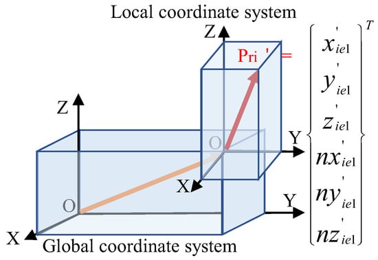Here, Pri′ (i = 1,2) denotes the pose of the closed-loop datum in the global coordinate system. The spatial gap of the closed loop is defined as the relationship between a pair of six-dimensional closed-loop datum coordinate systems Pri′. Based on this relationship, additional multidimensional closed-loop parameters can be derived, such as the maximum and minimum distances of closed loops and the parallelism of one datum plane relative to another. In Figure 9, (x1,y1) and (x2,y2) represent the boundary ranges of the closed-loop data. The closed-loop datum plane Pri′ is defined in the local coordinate system with the origin position vector [ox, oy, oz, 1]T and unit normal vector [nox, noy, noz, 0] T (e.g., [0, 0, 1, 0]T for Z-normal planes, respectively. The mating-constrained and non-mating-constrained datum plane errors are formulated as small displacement screws M and N, respectively (Equation (2)). Each component of M and N represents an error along six degrees of freedom, including rotations about the x-, y-, and z-axes and translations along these axes (Figure 10).