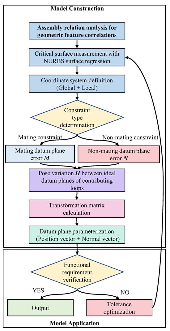 The error modeling method based on existing manufacturing processes and the NURBS surface regression method for extracting systematic errors serve as the foundational error data for constructing the SDC model. The core of SDC modeling lies in establishing constraint relationships between geometric elements (e.g., planes, axes) and analyzing error accumulation through a datum reference system. In this study, the term ‘datum’ refers to a theoretically exact feature (as defined in ISO GPS []). Its closed-loop characteristic relies on well-defined geometric data and constraint propagation paths. Thus, defining a datum coordinate system via geometric elements (e.g., mating surfaces) to constrain the error directions constitutes the fundamental requirement for establishing an SDC. Subsequently, the modeling data for mating surfaces are selected and classified. Since most parts demand high assembly precision and exhibit substantial rigidity, deformation is not considered in this model. Therefore, this study operated under the assumption of rigid body conditions.