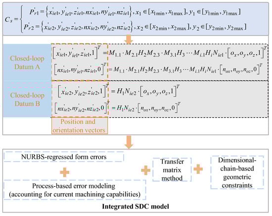 The proposed six-dimensional spatial dimension chain (SDC) model accounts for spatially distributed form errors during the design stage. The processing of the spatially distributed form errors follows the methodology in []—an error modeling approach that considers the distribution patterns of form errors induced by existing manufacturing processes at the design phase. This approach is predicated on the assumption that the machining errors remain statistically stable during a machine tool’s precision stability period. The machining errors on part surfaces comprise systematic errors and random errors. Systematic errors, as deterministic components, exhibit repeatability and predictability, constituting the dominant portion of the total errors; random errors lack regularity and typically account for a minor proportion. To establish manufacturing-process-referenced spatially distributed form errors, we inspect historically machined workpieces and employ NURBS (non-uniform rational B-spline)-based surface regression [] to extract and separate systematic and random errors, subsequently utilizing the systematic error morphology (including both magnitude and spatial distribution patterns) as the primary error model component. Anwer et al. [] made significant contributions to the field of tolerance analysis [,] by developing skin-model-based approaches, which utilize statistical distributions and idealized geometric deviation assumptions. In contrast to these methods, the present work establishes a fundamentally distinct manufacturing-feature-driven modeling process based on actual machining process data.