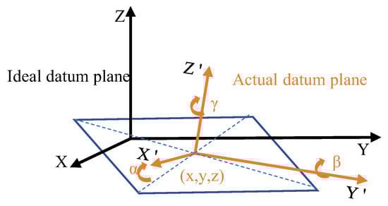An ideal datum plane is fitted to the actual error surface S through asymptotic convergence, subject to the following constraints. The ideal plane does not interfere with the actual error surface S, and there exist at least three contact points between the ideal plane and S, P1(x1′, y1′, z1′), P2(x2′, y2′, z2′), and P3(x3′, y3′, z3′), as formalized in Equation (5):