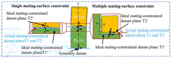 (1) The SMSC: As shown in the left panel of Figure 11, the coordinate system of the mating-constrained datum plane is established at both the ideal mating position (critical surfaces T1’ and T2’) and the actual mating position (critical surfaces T1 or T2). The mating-constrained datum error, denoted as , corresponds to the error between the ideal mating-constrained datum plane T1’ and the actual mating-constrained datum plane T1, or between T2’ and T2. This error is characterized by six geometric error components, including rotations about and translations along the x-, y-, and z-axes.