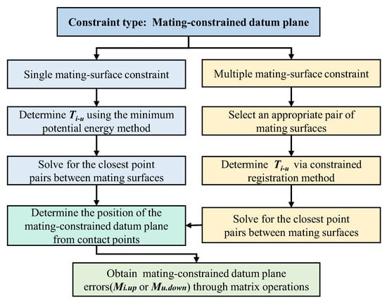 As illustrated in Figure 11, the middle panel serves as the primary schematic. A global coordinate system is established at the assembly datum, followed by the sequential assembly of part A and part B. The distance between the top surface of part B and the bottom surface of part A constitutes the closed loop, while the spatial distances between the top and bottom surfaces of part A and part B act as the contributing loops. The mating surfaces of both parts belong to the mating-constrained datum plane category. Based on the quantity of mating surfaces, the mating-constrained datum planes are classified into the single mating surface constraint (SMSC, left panel of Figure 11) and the multiple mating surface constraint (MMSC, right panel of Figure 11). The subsequent analyses focus on characterizing the mating-constrained datum plane and solving its associated errors under both scenarios, with the key procedural steps detailed in Figure 12.