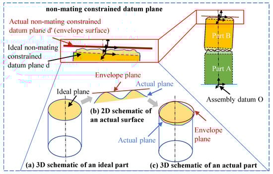 To ensure part interchangeability and assembly quality, this subsection introduces an improved envelope condition (also referred to as the envelope requirement in some standards) and proposes new definitions of the envelope surface and envelope area. The envelope surface is then used to characterize the actual non-mating-constrained datum plane, from which the non-mating-constrained datum plane error is derived. This error is characterized by six geometric error components, including rotations about and translations along the x-, y-, and z-axes. As illustrated in Figure 13, taking a simplified cylindrical casing as an example, a global coordinate system is established at the assembly datum O, followed by the sequential assembly of part A and part B. The distance between the top surface of part B and the bottom surface of part A forms the closed loop. As established in Section 2.1, the top surface of Part B is a non-mating-constrained datum plane. To characterize this plane using the envelope surface, the envelope surface must first be determined based on the envelope condition—a constraint ensuring that the non-mating-constrained datum plane error maintains dimensional and form compliance with assembly requirements under error conditions.