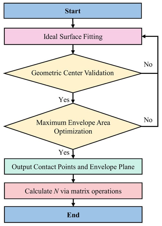 To ensure the envelope surface maximally encompasses the actual surface for optimal conformity and improved model accuracy, the maximum envelope area (max Sarea) must be determined. The envelope area Sarea, defined by the contact points P1, P2, and P3 (Equation (6)), is evaluated. If the condition is satisfied, the procedure proceeds; otherwise, it returns to step 1.