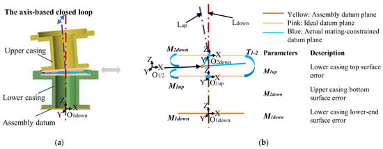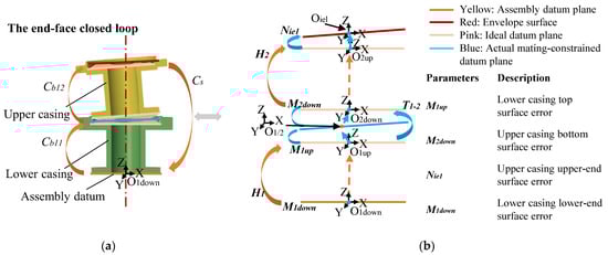 The contributing loops are Cb11 and Cb12, as shown in Figure 15a, with the closed loop Cs representing the spatial dimension from the upper end face Oiel of the upper casing to the assembly datum face Oldown. Following the aforementioned computational process, the coordinate systems for critical surfaces are established and the influencing factors of SDC errors are analyzed, as depicted in Figure 15b.