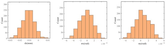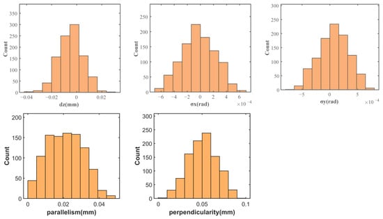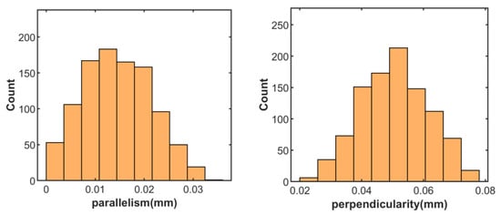 Case 1: As previously discussed, the geometric errors in the upper end face of the lower casing and both end faces of the upper casing are critical factors influencing the closed loop. The specific parameters are as follows: dimensional tolerance [−0.011, 0.014] mm, positional tolerance (parallelism) [0, 0.02] mm, and form tolerance (flatness) [0, 0.01] mm. Regarding the simulation results, the displacement in the z-direction is primarily distributed within the range of [−0.014, −0.006] mm, with 492 data points. The rotational error about the x-axis is mainly distributed within [−0.00016, 0.00017] rad, with 604 data points, while the rotational error about the y-axis is mainly distributed within [0.00005, 0.00015] rad, with 411 data points. The parallelism of the envelope surface achieves a compliance rate of 93% within the [0, 0.025] mm range, whereas the perpendicularity compliance rate is 79% within the [0, 0.06] mm range. The result distribution is illustrated in Figure 27.