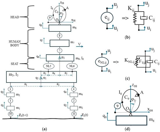 27], a nonlinear biomechanical model of the upper body was developed to investigate disturbances transmitted to passengers by the vehicle. The model accurately replicates experimental data and accounts for flexural motion. It predicts low-amplitude sagittal movements and provides greater geometric and analytical insight into the internal dynamics of the upper body. The model indicates that the peak vibration transmission frequency is 4.5 Hz, which can be valuable for vibration reduction and control system design.