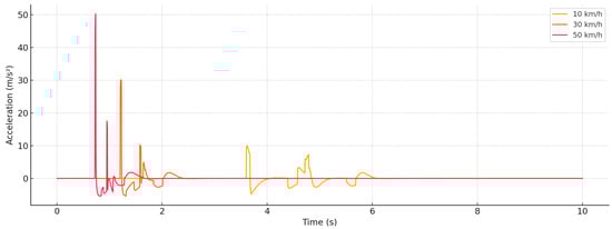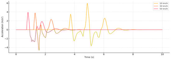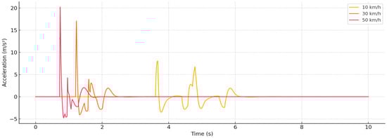 Figure 5, a clear trend is observed: higher speed causes significantly higher vertical acceleration, and impacts become short-term but intense. At 50 km/h, a sudden impact with a peak exceeding 20 m/s