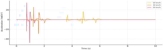 2. These data reflect an exponential increase in the response with increasing speed, which is explained by the greater energy transferred in a shorter time and the increased frequency composition of vibrations. Due to these factors, the response in the body area becomes impulsive, and the system is no longer able to effectively absorb the impact. In addition, it is notable that the impact moment time shortens with increasing speed—at 50 km/h, the first significant impact is recorded already at 0.7 s, while at 10 km/h—only about 3.8 s. This confirms that higher speed not only enhances the mechanical response, but also accelerates the reaction of the entire dynamic chain to road irregularities.