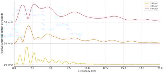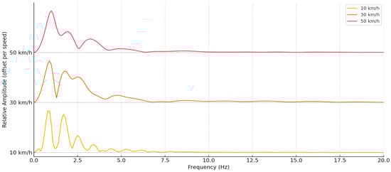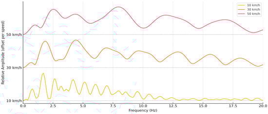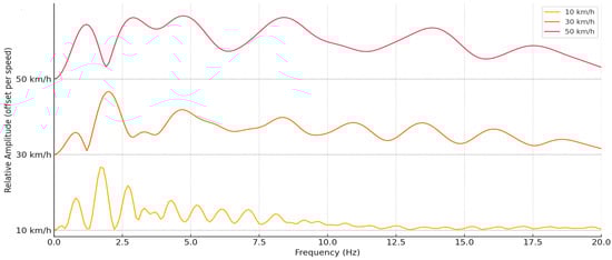 As the speed increases, a significant transformation of the amplitudes is observed: at 10 km/h, pronounced but narrower modal peaks are observed, while at 30 km/h and especially at 50 km/h—the curve becomes more diffuse, with more widely spread oscillations and a higher total amplitude value. This reflects the energetic expansion of oscillations in the frequency domain with increasing speed, when shorter and more intense pulses create a wider frequency spectrum.
