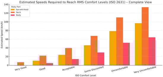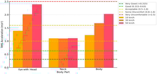 28], and the additional horizontal lines reflect the standardized RMS comfort limits, which allow classifying the effects of vibrations according to the intensity of the impact. This allows us not only to quantitatively assess the intensity of vibrations, but also to draw qualitative conclusions about the comfort state and risks to human health. First of all, a clear increase in RMS acceleration can be observed in all body areas with increasing speed. However, this increase is not uniform between segments. In the eye with head area at 10 km/h, the RMS value is about 1.4 m/s
