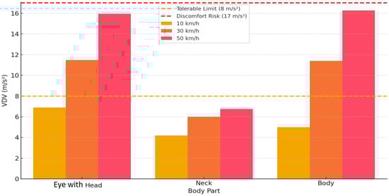 4—the risk of discomfort/injury. When analyzing the results, a clear trend is observed: higher speed causes exponentially increasing VDV in all body areas. All body sections stay below the 8 m/s’ criterion at 10 km/h, indicating that the vibration load stays acceptable. At 30 km/h, both the head and body exceed 8 m/s