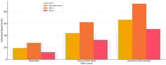 Figure 14 visualizes the calculated transport speeds required to reach the ISO 2631 VDV thresholds in three different areas of the human body—eye with head, neck and body. The horizontal axis shows the three comfort levels according to the ISO classification: “Tolerable”, “Discomfort Risk” and “Extreme Discomfort”, and the vertical axis shows the corresponding speed in km/h that would cause a specific VDV level. This analysis is based on empirical data and modeled by linear regression, allowing us to predict the moment when the vibration dose exceeds physiologically or ergonomically acceptable levels.