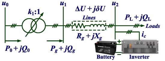 The schematic diagram of the low-voltage distribution network is displayed in Figure 1. and denote the high voltage side voltage and low voltage side voltage of 10 kV distribution transformer, respectively. denotes the terminal voltage of the distribution network. denotes the feed line impedance. and indicate the grid transmission power and the load power, respectively. The subscript indicates a -axis vector of the synchronous coordinate system. From Figure 1, the voltage transmission loss can be described as . Moreover, since the phase variation in electric energy is relatively small in the transmission process, the transverse component of the voltage loss can be ignored. Thus, there are the following mathematical relationships [27]: