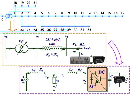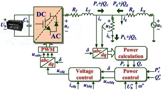 The grid-connected equivalent model of the inverter is illustrated in Figure 2, which consists of the battery pack, the GFM inverter, the L filter, the feeder impedance, and loads. The voltage source is used to simulate the distribution network, and and are the filter inductance and parasitic resistance. The GFM inverter is connected with the distribution network in parallel with the load.