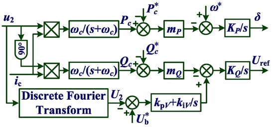 The power synchronization and the current control of the GFM inverter ensure the terminal voltage stability of the distribution network and achieve reactive power compensation. When the terminal voltage exceeds the limit, the proposed GFM scheme is activated to provide users with partial active support and reactive power compensation, alleviating voltage fluctuation and reducing the power supply pressure of the distribution network. The schematic of the proposed GFM scheme is presented in Figure 6, where , and the specific expression is as follows: