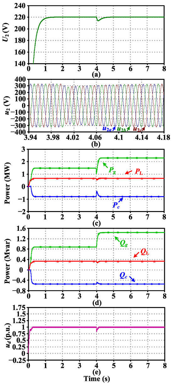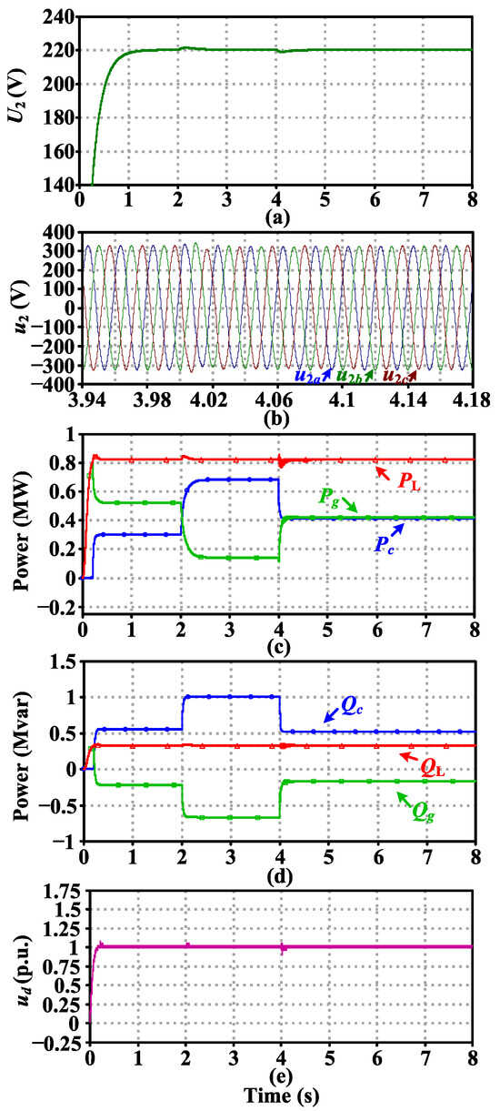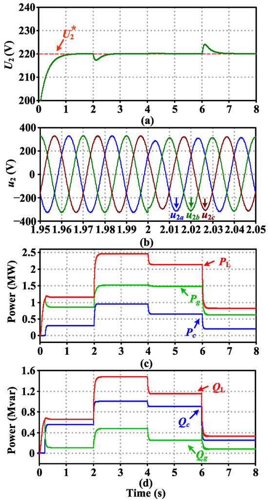 The system dynamic results with load variations are illustrated in Figure 9. The load variations simulate changes in user electricity consumption. The power increases and decreases represent the surges and sags in user demand, respectively. It can be observed from Figure 9a,b that, when the power consumption changes, the proposed method rapidly stabilizes the terminal voltage, effectively reducing voltage fluctuations and improving user voltage quality. Moreover, the proposed approach demonstrates a satisfactory power compensation effect, further improving the power quality of the distribution network, as shown in Figure 9c,d.