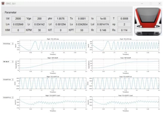 Figure 1 presents the Traction Drive Control System-Fault Injection Benchmark (TDCS-FIB) experimental platform specifically developed for high-speed EMUs by Central South University. Built upon the physical traction drive architecture of CRH2 EMUs, this platform facilitates the precise simulation and controlled injection of diverse electrical fault types. Within this simulation framework, traction motor bearing faults were replicated under controlled conditions (3-s duration with fault injection initiated at the 1-s mark). The generated simulation data (shown as in Figure 2) consists of six variables: stator winding current , , , train speed , motor rotation speed , and electromagnetic torque .