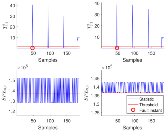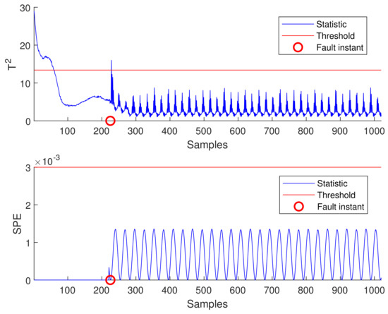 where , the and statistics are used to detect deviations from the model and variations in the principal component space, respectively.