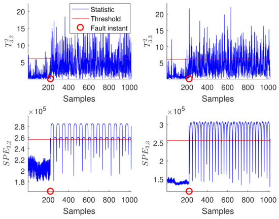 Analysis of the TDCS-FIB dataset experimental findings demonstrates that augmenting DPCA decomposition layers generates additional sample subsets and statistical parameters, thereby achieving theoretical enhancement of fault detection capabilities. Nevertheless, this configuration concurrently induces nonlinear escalation in computational complexity and associated computational expenditure. Therefore, this paper selects second-order expansion of the original samples, generating four subset datasets and corresponding eight detection statistics, by comprehensively considering detection accuracy requirements, computational complexity, and system resource allocation constraints. Due to space limitations, this paper only selects the residual matrix of the principal space and the principal component matrix of the residual space, along with their most significantly varying statistics , , , and to characterize detection performance. This selection strategy demonstrates distinct technical merits in the following critical dimensions: