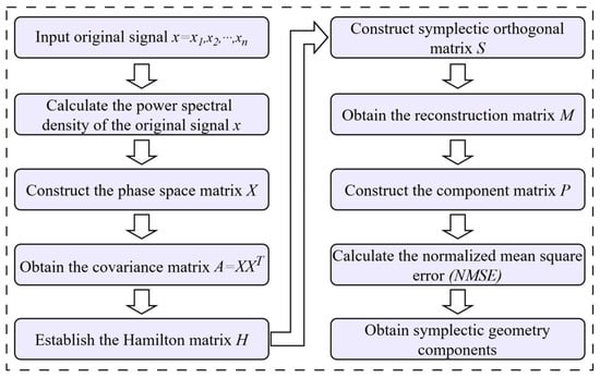 Currently, the popular signal decomposition methods in the field of fault diagnosis include empirical mode decomposition [33], local characteristic decomposition [34], singular spectrum analysis [35], etc. As a rising star, the symplectic geometry modal decomposition method (SGMD) uses symplectic geometry similarity transformation compared to commonly used methods. Its advantages are that it keeps the essential characteristics of the original time series unchanged and can effectively suppress modal aliasing. It has obvious advantages without changing the essential characteristics of the time series and without the need for custom parameters [36,37]. Figure 1 summarizes the flowchart of the SGMD, which can be divided into the following four steps:
