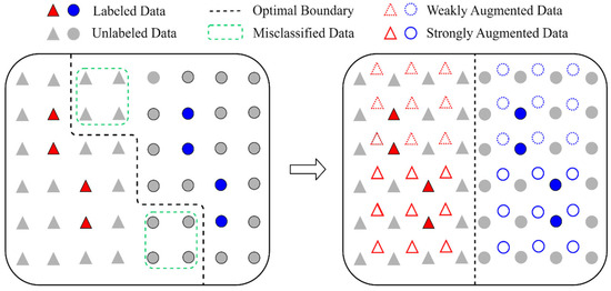 Assume that the labeled dataset is denoted as , where denotes the -th labeled sample, denotes the true label of the -th labeled sample, and denotes the number of samples in the labeled dataset. The unlabeled dataset is denoted as , where denotes the -th unlabeled sample and denotes the number of samples in the unlabeled dataset. Supervised loss is introduced , as shown in the following Equation (23).