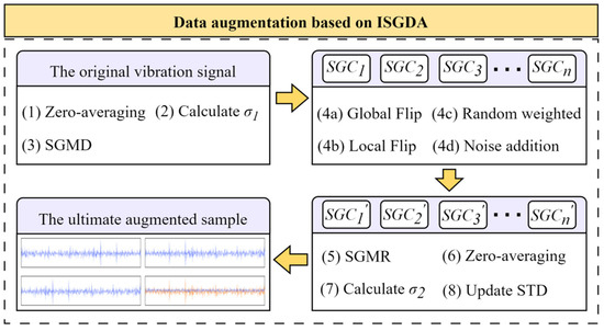 This paper constructs a consistency strategy based on the symplectic geometry modal decomposition method concerning the raw data and augmented samples with average and normal deviation, which applies additional perturbations to the samples while preserving the effective fault characteristics. Four different data enhancement methods including amplitude scaling, overall flipping, local slice flipping and adding Gaussian white noise are proposed. The ISGDA specific methodology flow is shown in Figure 3.