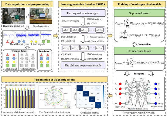 In this paper, the KAN is combined to perform analysis and validation in Figure 5. The trial of the hydraulic pump in various working situations is firstly carried out to obtain the vibration signal and perform data preprocessing. Next, the suggested ISGDA is employed on the delineated dataset to generate different enhanced versions of the data, matching the features of the original samples, enriching the feature space of the pump with finitely labeled examples in various operating states. Then, the model training process is normalized by supervised and unsupervised consistency loss to enhance the model’s anti-perturbation ability, which is combined with the KAN. Finally, various types of results from the model diagnostic analysis are visualized.