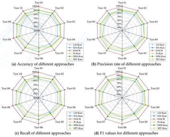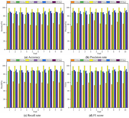 Figure 11 illustrates the results of the four evaluation indicators of the different approaches over the ten trials, with the DACR approach performing the best in each test. The average and standard deviation of the evaluation indicators are summarized in Table 8. The mean accuracy rate of DACR is 99.37%, which is 47.62%, 16.32%, 10.05%, 8.31%, and 13.41% higher compared to LD-Kan, DA-Kan, Pi-Kan, MM-Kan, and MT-Kan, respectively. DACR equally outperforms the other five approaches with respect to precision, recall, and F1 scores. Notably, the approach has the lowest fluctuation in average accuracy at 0.01%. These data indicate that the DACR approach is not only capable of delivering superior performance but also excels in consistency and stability.