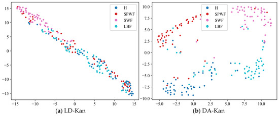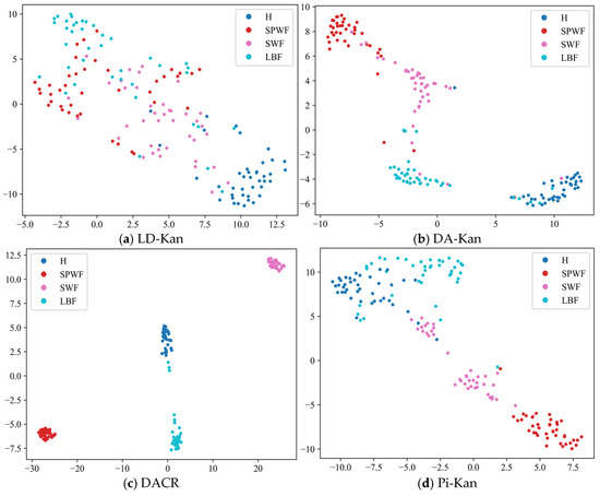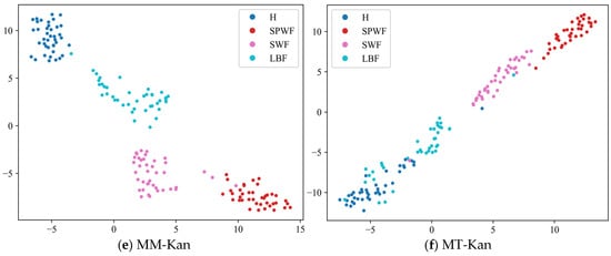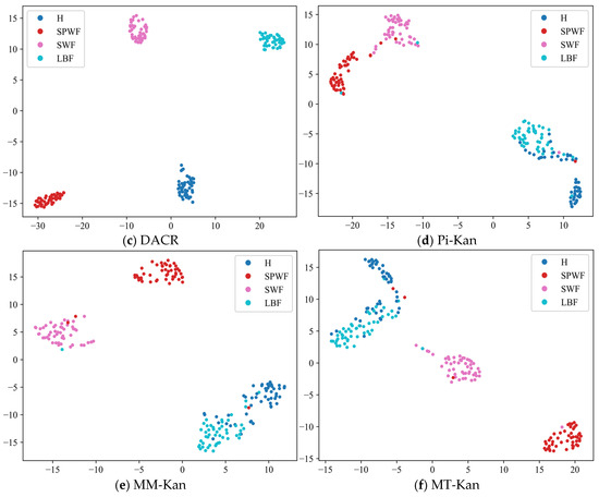 To demonstrate better visualization of the advantages of the DACR approach in spatial distribution, the high dimensional characteristic spreads generated by various approaches are compared by T-SNE technique. Figure 12 illustrates the feature dimension decrease results of LD-Kan, DA-Kan, Pi-Kan, MM-Kan, MT-Kan, and DACR approaches. The features of the DACR approach display a more obvious clustering effect on the spatial distribution and have a clearer category differentiation compared to the other approaches.